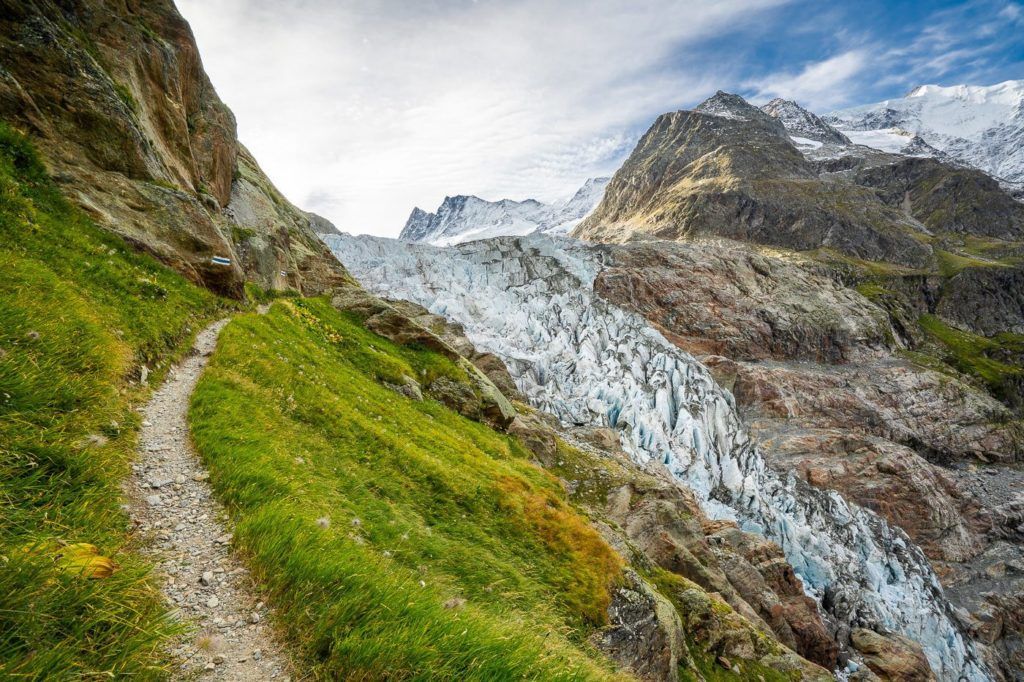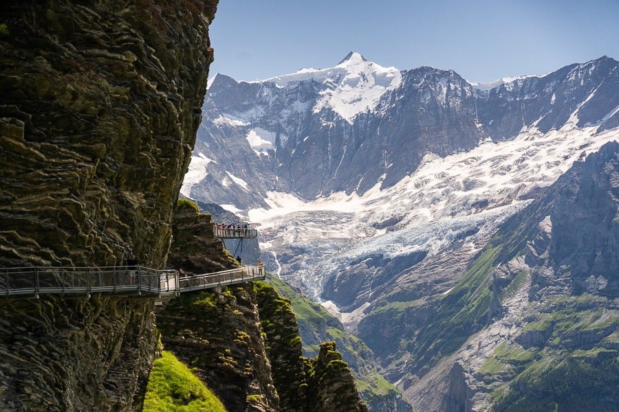 The trail runs alongside the Lower Grindelwald Glacier, or at least where it once was, following the edge of the cliff. This hike provides a clear demonstration of how much the glacier has receded over the past century and a half.