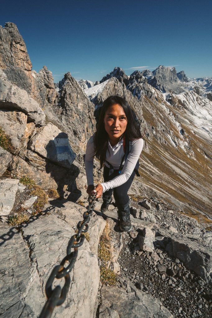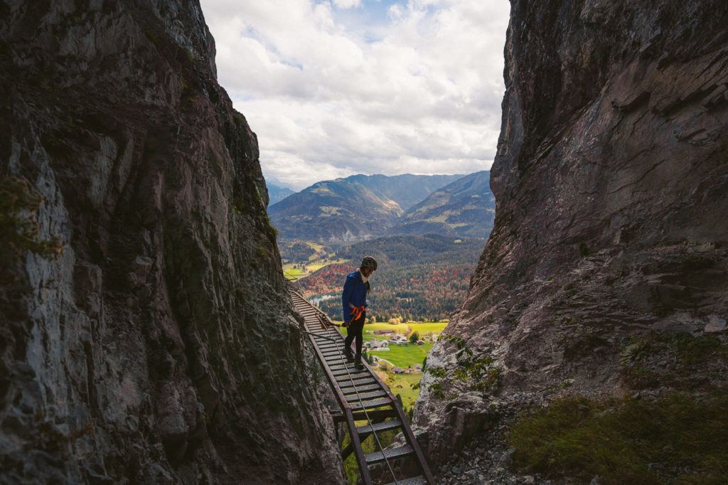 If you’re not familiar with Via Ferrata, it’s a route marked by a series of ladders, steps, and rock climbing sections that help you ascend a vertical cliff. You’ll be wearing a harness and attaching yourself to a steel cable at the start of the route. Throughout the climb, you’ll always be secured to the cable with at least one clip.