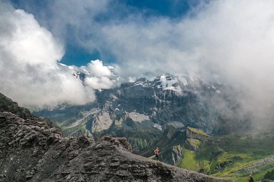 Tanzbodeli is one of my favorite hikes in the Lauterbrunnen region because it provides the best 360 degrees of the entire mountainscape. On a clear day, it feels as though you are at the center of the Jungfrau region and you can see all of the glacier-laden peaks. On a gloomy, cloudy day, it is equally impressive as you are seemingly inside a cloud, on top of the world. We had bits of both on our journey to Tanzbodeli and Obersteinberg from Gimmelwald. If you are looking for a great view of the Swiss Alps, hike up to Tanzbodeli on a clear day as the plateau at the summit is known as one of the best places to hike in the Jungfrau region for views of the Swiss Alps.