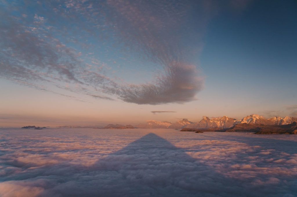 One of the most remarkable sights in Thun is a peak that stands out above the clouds for its unique pyramid shape. The peak also features a mountain hut restaurant on top, making it a popular destination for visitors. From the photos, you can see the pyramid’s shadow cast during sunset. This solo hike was one of my favorites in Switzerland, as I had the fortune of witnessing an epic sunset and clear skies.