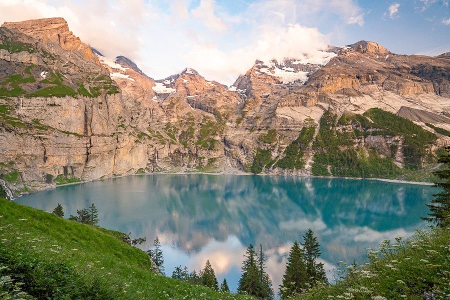 Bachalpsee is one of the most stunning alpine lakes in Switzerland. It is surrounded by wildflowers and adorned with an incredible backdrop of glacial mountains. The beauty of the Bachalpsee Lake is that there is a cable car to First, making it just a one-hour trek from the First station to the lake, despite being located at 2,265m in altitude. This hike is one of the most impressive near Interlaken, offering everything one could ask for. The lake is incredible, and the mountain hut is one of the best ones I have been to. It is easily one of the best hikes in Switzerland.