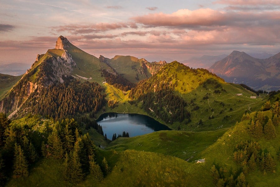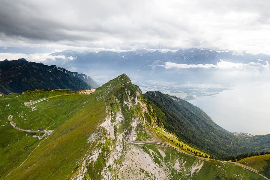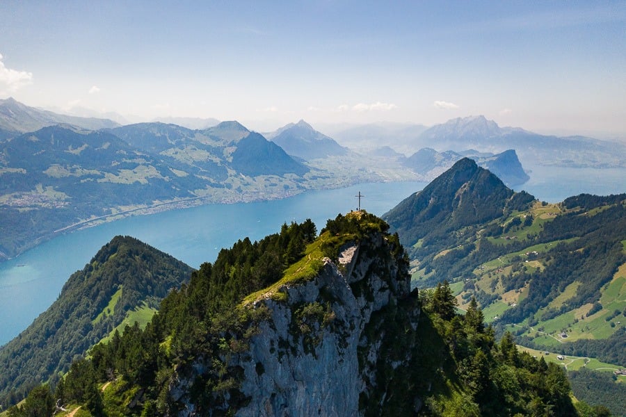 At the summit, we hung out on the ridge that overlooks the western end of Lake Thun and was all by ourselves the entire time. We watched as paragliders took off (I watched that one from my drone, which was a little scary), scoped out Lake Thun, and looked at the small huts in the valley below.
