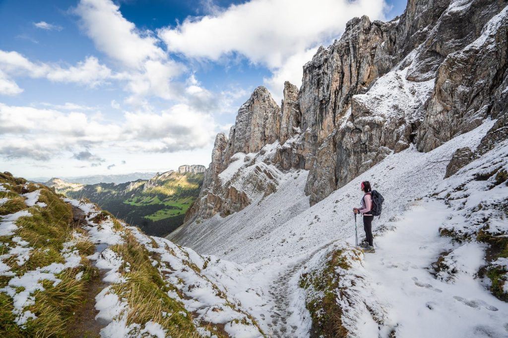 To get there, you will book a ticket on a 125-year-old cogwheel train from Wilderswil to Schynige Platte mountain ridge. This hike is also quite special because it has views of Brienzersee along the way before heading up past alpine lakes to the Fualhorn Mountain Hut. I did this iconic hike near Interlaken after the first snow of the season and it was just stunning. It’s also a great hike for the middle of the spring when the alpine flowers are in full bloom.