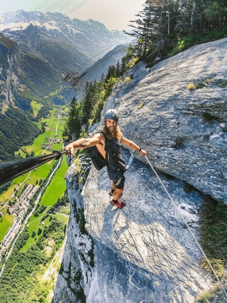 The Via Ferrata from Murren to Gimmelwald is an epic adventure in Switzerland, where you traverse ladders and steps on the edge of a cliff overlooking Lauterbrunnen, all while being safely strapped in with a harness.