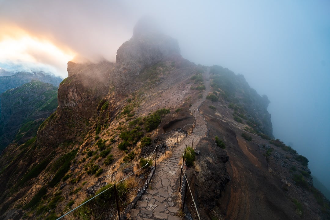 Known as ‘Pico to Pico’, the hike from Pico do Arieiro to Pico Ruivo (PR1) is the most famous hike on the island of Madeira. This tunnel route leads hikers along narrow pathways, up and down ominous staircases, and through dark tunnel chambers. The best way to experience this hike is to drive up to Pico do Arieiro for sunrise and then begin the hike to Pico Ruivo, which is the highest point on Madeira at 1,862 meters. It’s 550 meters of incline each way so you will gain a vertical kilometer after you return to Pico do Arieiro.