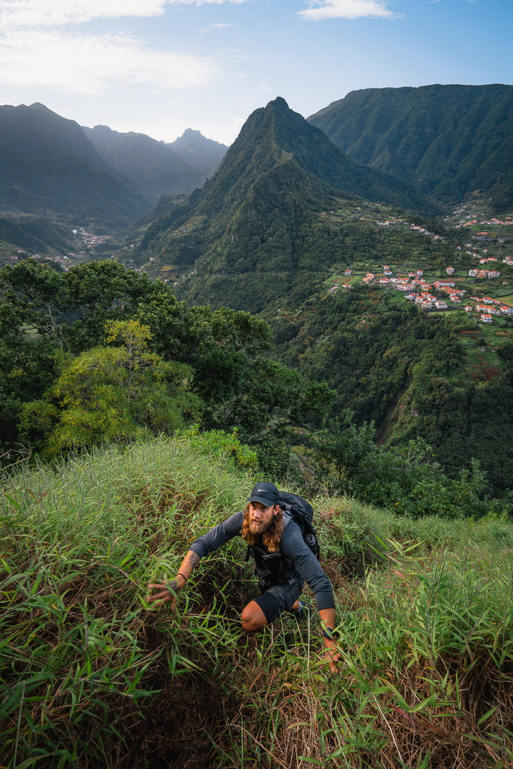 In the center of Boaventura is the Meiodia Ridge. It’s not a common hike but there is a levada that wraps around it for regular hiking trips. However, on this mission, we took an adventurous route off-the-beaten-path to reach the upper ridge. We then traversed the ridge all the way to the end before dropping back down into the village. This Madeira hike gives you spectacular views over the townships below and all the way to the ocean.