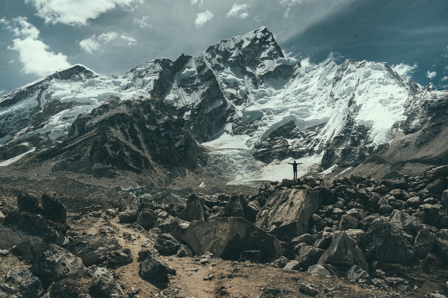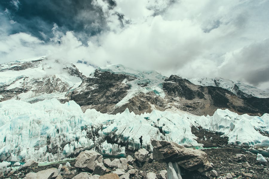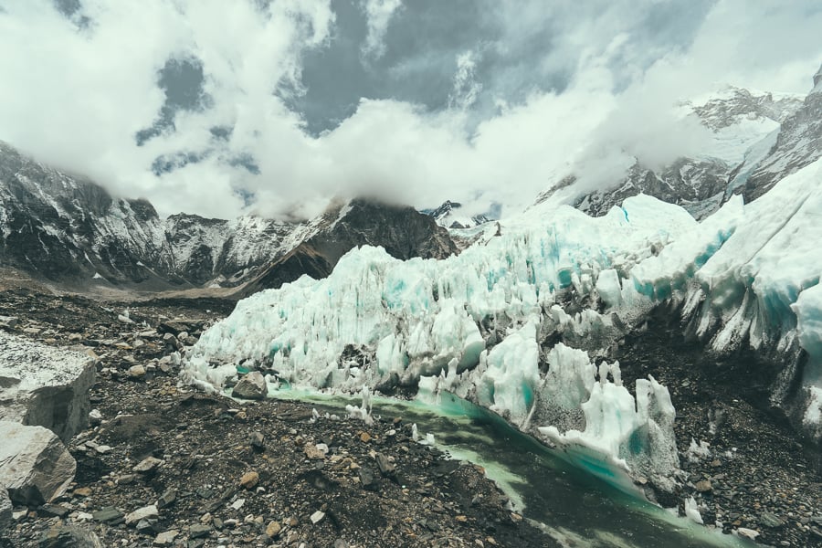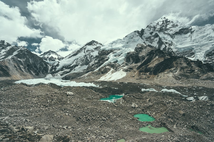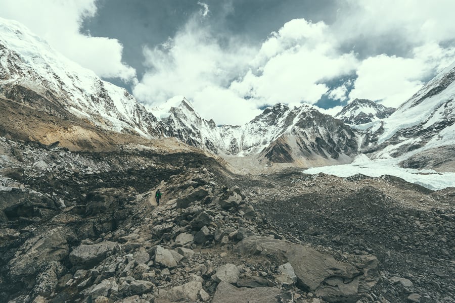 The trail continues alongside the glacier until you reach Everest Base Camp. It’s interesting because you actually can’t see Mount Everest from the base camp, which surprised me but the surrounding peaks are still very impressive and dramatic. Depending on if you come during the climbing season or off-season will alter how the base camp looks. I visited in the low season so there were no tents set up and it was pretty barren.