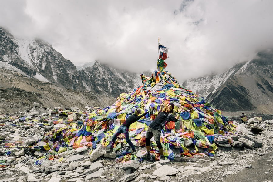 The trail continues past some Sherpa prayer flags as the rocky terrain leads you towards the famous Everest Base Camp rock, which is covered in hundreds of prayer flags. We’ve made it!