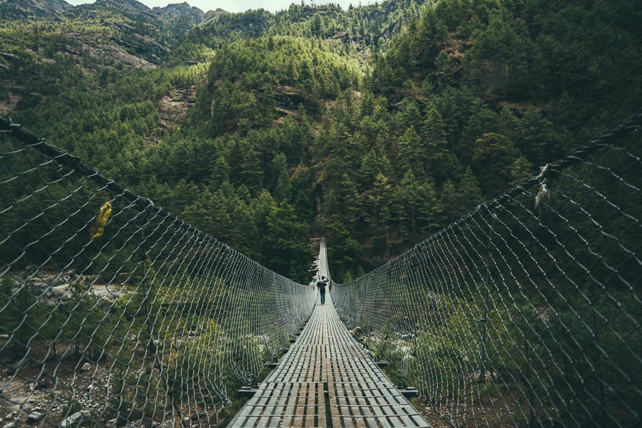When you leave Tengboche, you begin a descent into the beautiful forest and can enjoy the shade as you pass through the village of Deboche. After you pass through Deboche, the trail gains some elevation and you will cross a suspension bridge, which guides you to the left side of the valley. Ama Dablam is still in view as you navigate the steep sections of the incline.