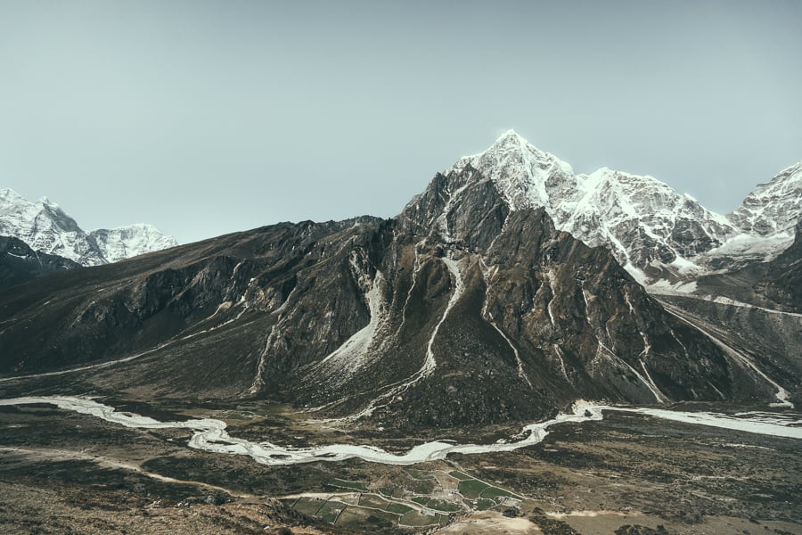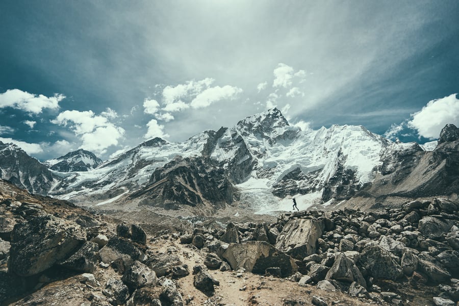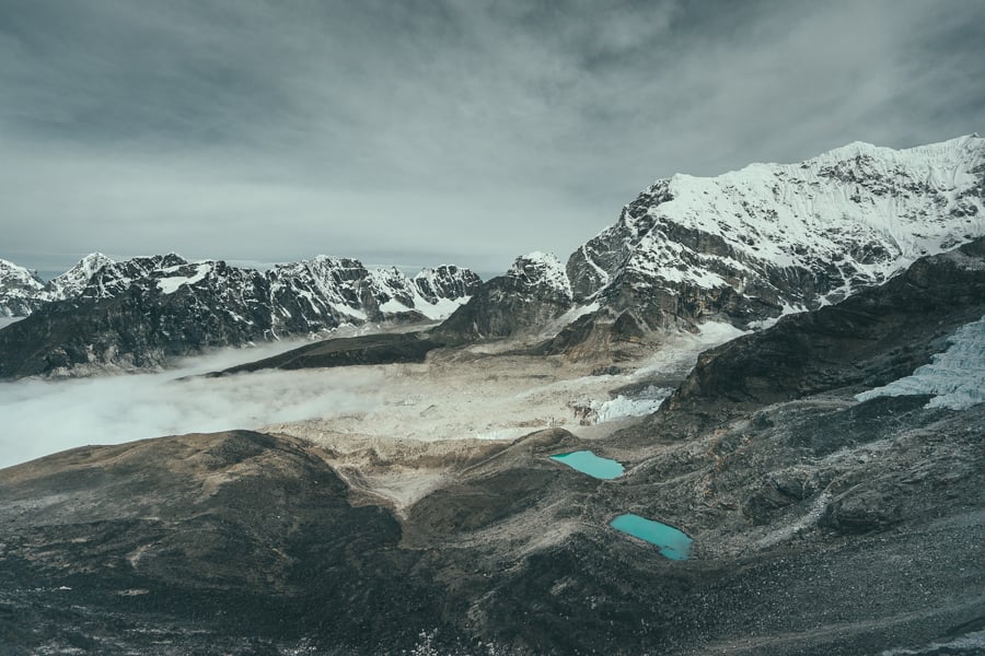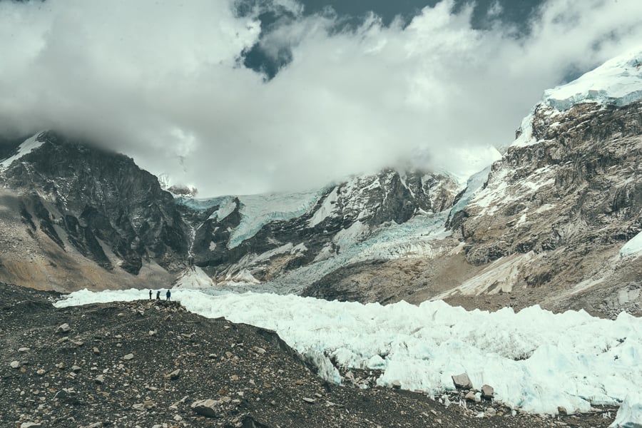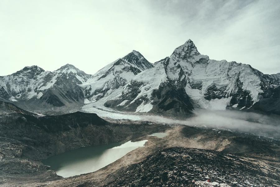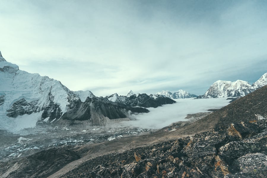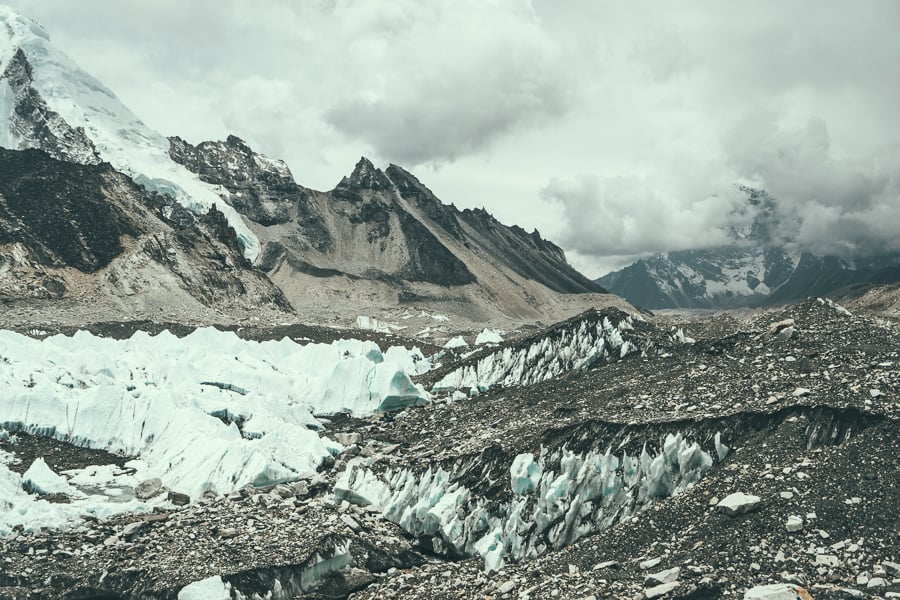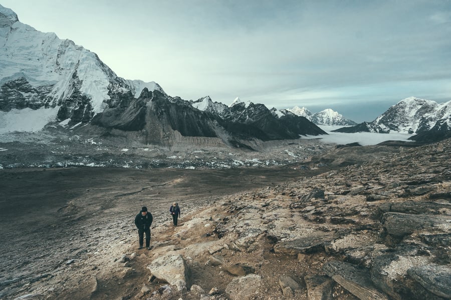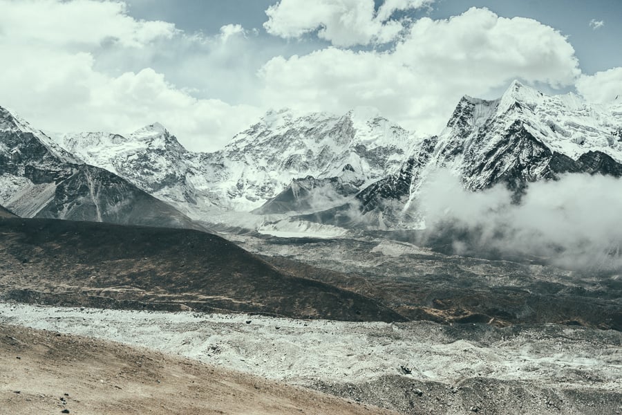 When you leave Gorak Shep you walk next to the Khumbu Glacier with the Everest Mountain Range looming behind. The glacier is covered in dust and rocks due to the sediments, which have been falling from the surrounding peaks over the last years.