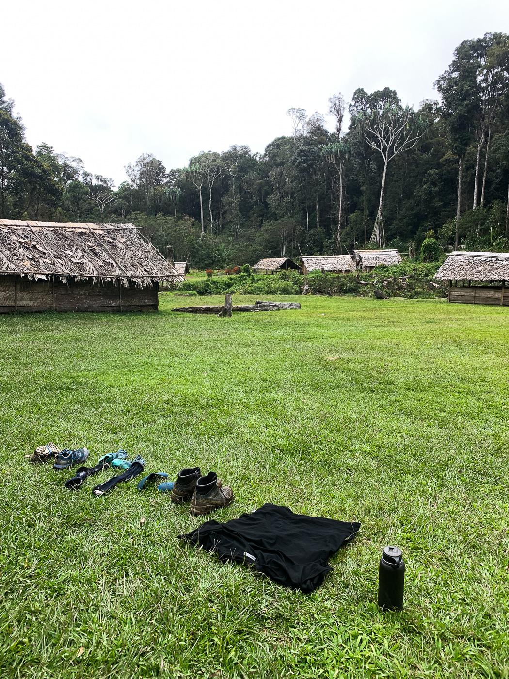 To keep warm at the camps or after I jumped in the river to wash, I kept warm with a lightweight down jacket. In the highlands of the Kokoda Trail, I also slept in this for added warmth. At night in an open-air hut at 1900m of altitude, the air can be chilly overnight so, with a lightweight sleeping bag, I slept in my down jacket on two of the nights. On other nights just my t-shirt at a lower altitude.